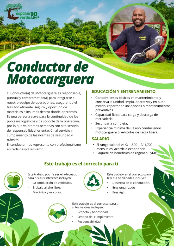 En Espacio Verde buscamos Conductor de Motocarguera responsable y puntual para apoyar nuestras operaciones de campo. Se valorará experiencia en reparto, carga y rutas locales. Ofrecemos estabilidad laboral, buen clima de trabajo y desarrollo. Forma parte de un equipo comprometido con el servicio y la sostenibilidad. Postula hoy mismo aquí.