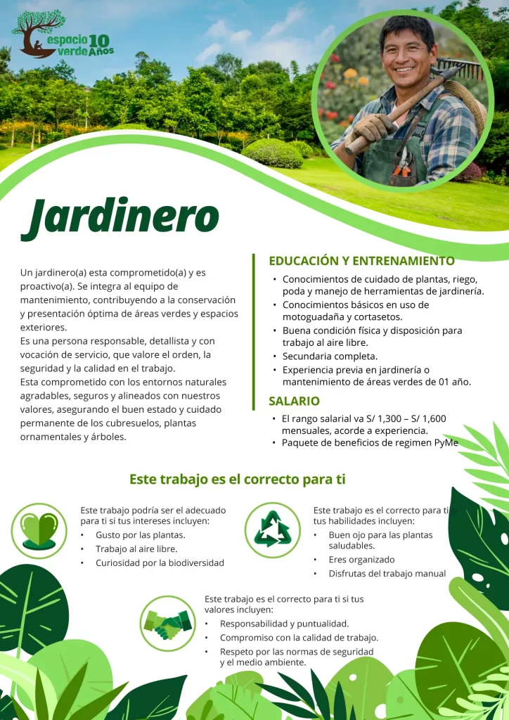 En Espacio Verde buscamos jardinero comprometido y responsable para integrarse a nuestro equipo. Valoramos experiencia en mantenimiento de áreas verdes, poda y riego. Ofrecemos trabajo estable, buen ambiente laboral y oportunidades de crecimiento. Únete y ayuda a crear espacios naturales de calidad con nosotros, postula hoy mismo, te esperamos aquí.